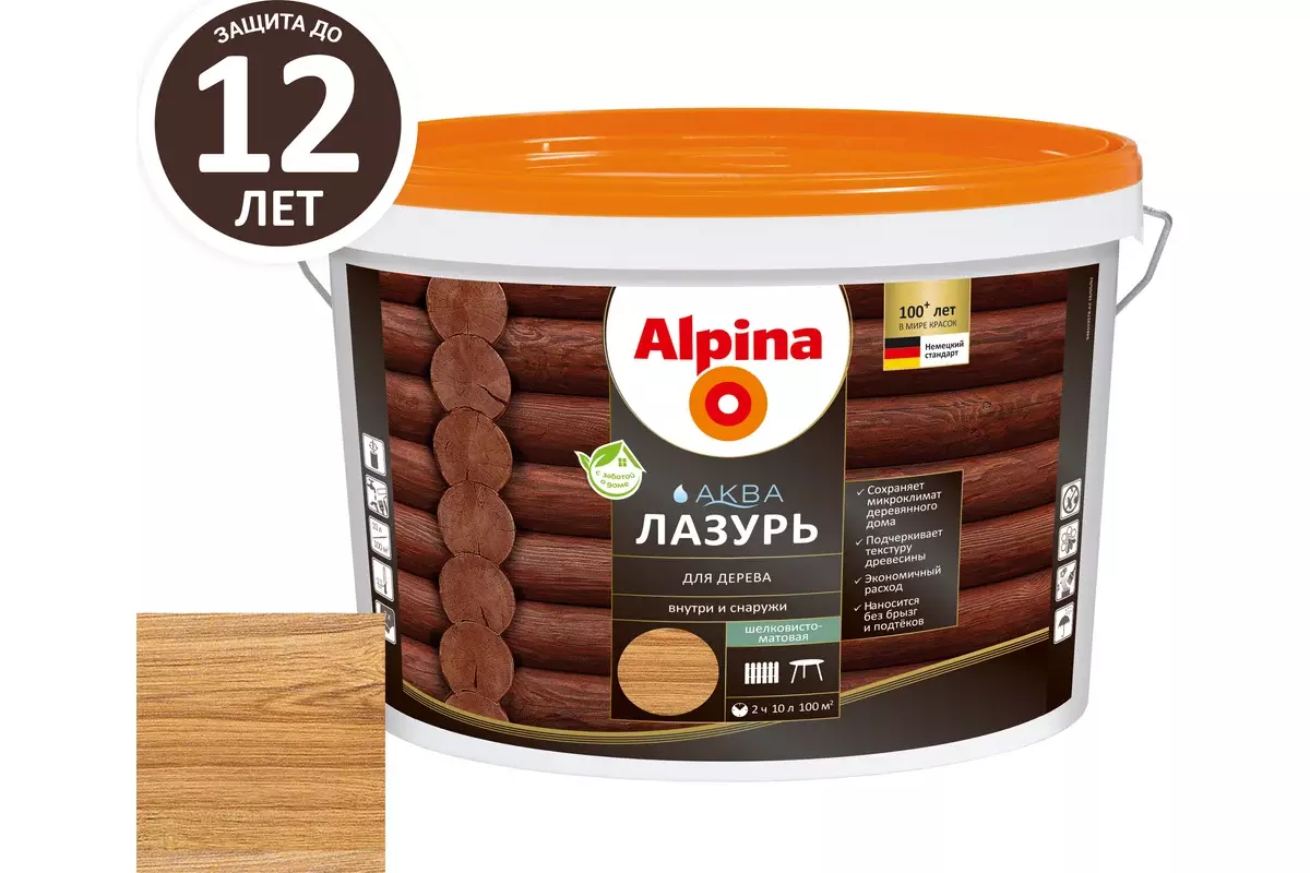 **Alpina Аква Лазурь** легко наносится кистью, валиком или распылителем, образуя полупрозрачное покрытие, которое сохраняет естественную красоту древесины. Антисептик обладает высокой паропроницаемостью, позволяя дереву "дышать", что продлевает срок его службы. Объем 10 л оптимален для обработки больших площадей, а цвет Орех придает поверхности теплый и эстетичный вид. Бренд Alpina гарантирует качество и долговечность покрытия, делая этот продукт отличным решением для профессионального и домашнего использования.